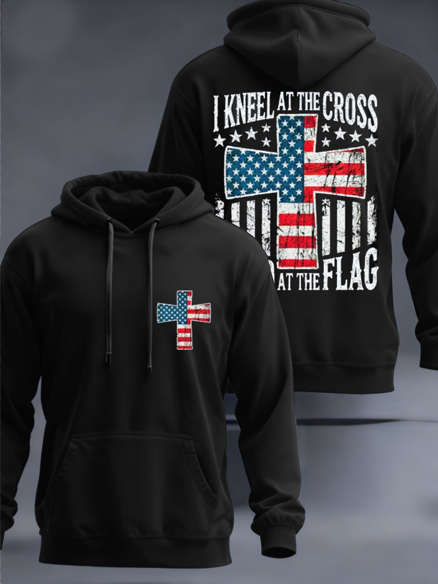 Men's I Kneel At The Cross Stand At The Flag American Flag Cross Hooded Sweatshirt