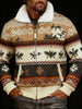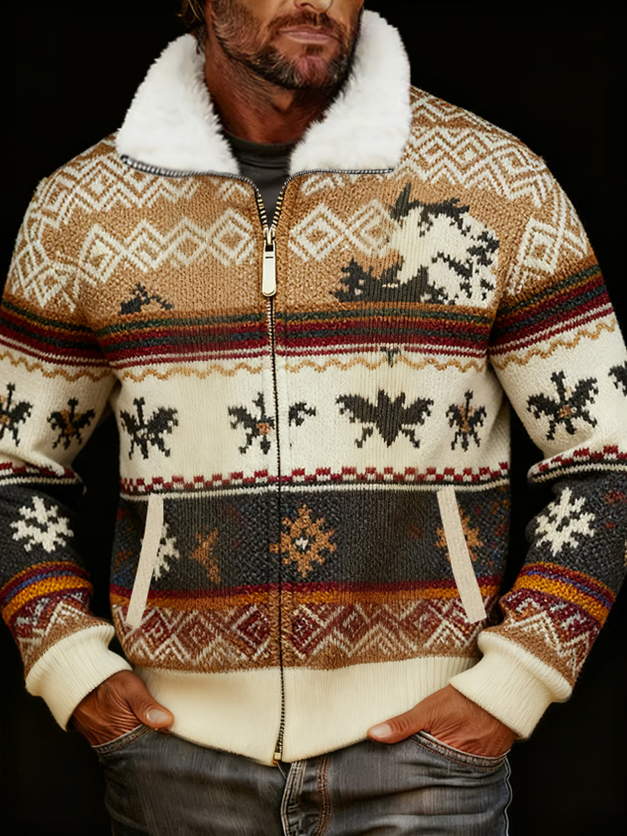 Men's Retro Cable Pattern Print Casual Fur Collar Zip-Up Jacket