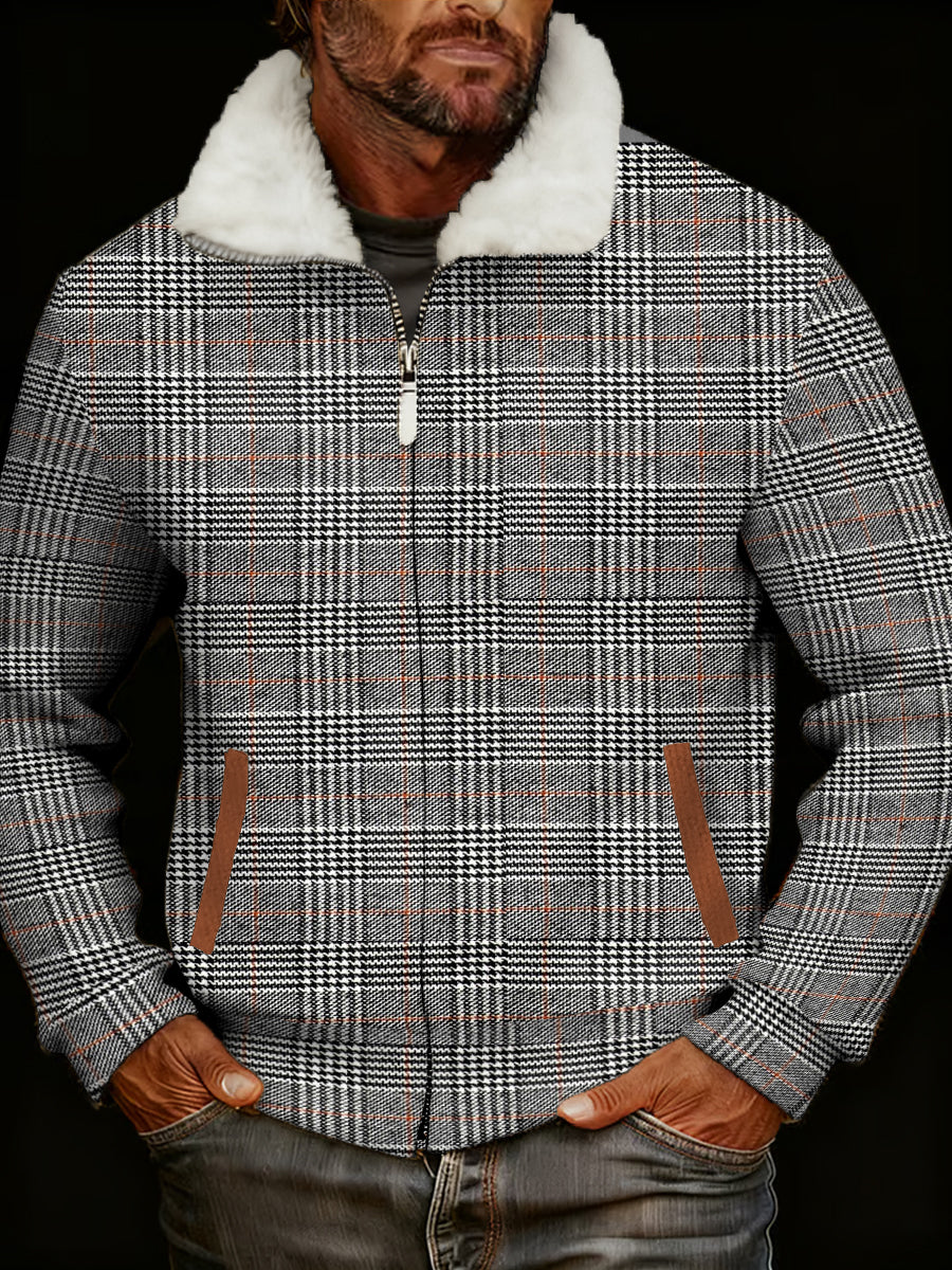 Men's Retro Casual Houndstooth Printed Fur Collar Zip-Up Jacket