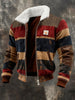 Men's Retro Color Block Print Casual Fur Collar Zip-up Sweatshirt