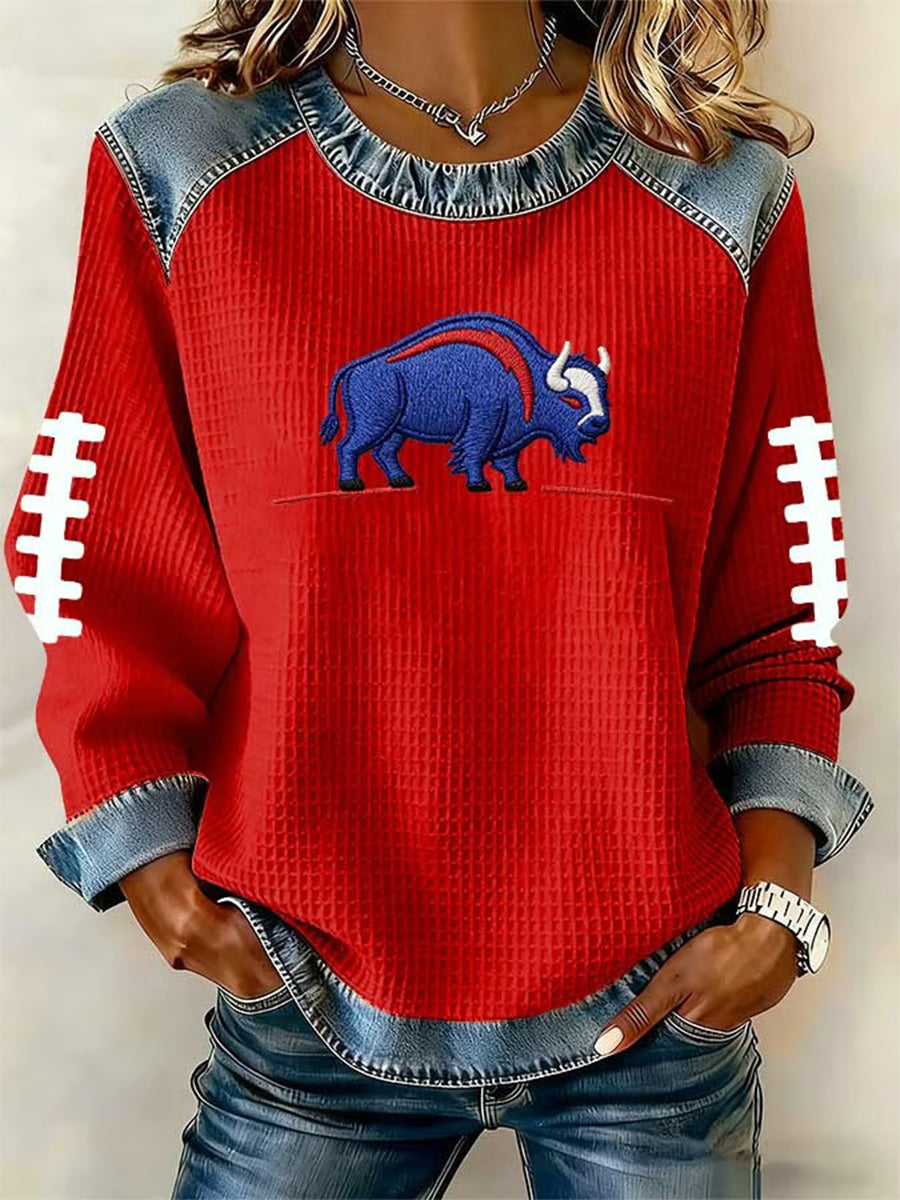 Women's Buffalo Print Football Fans Gameday Casual Denim Patchwork Top