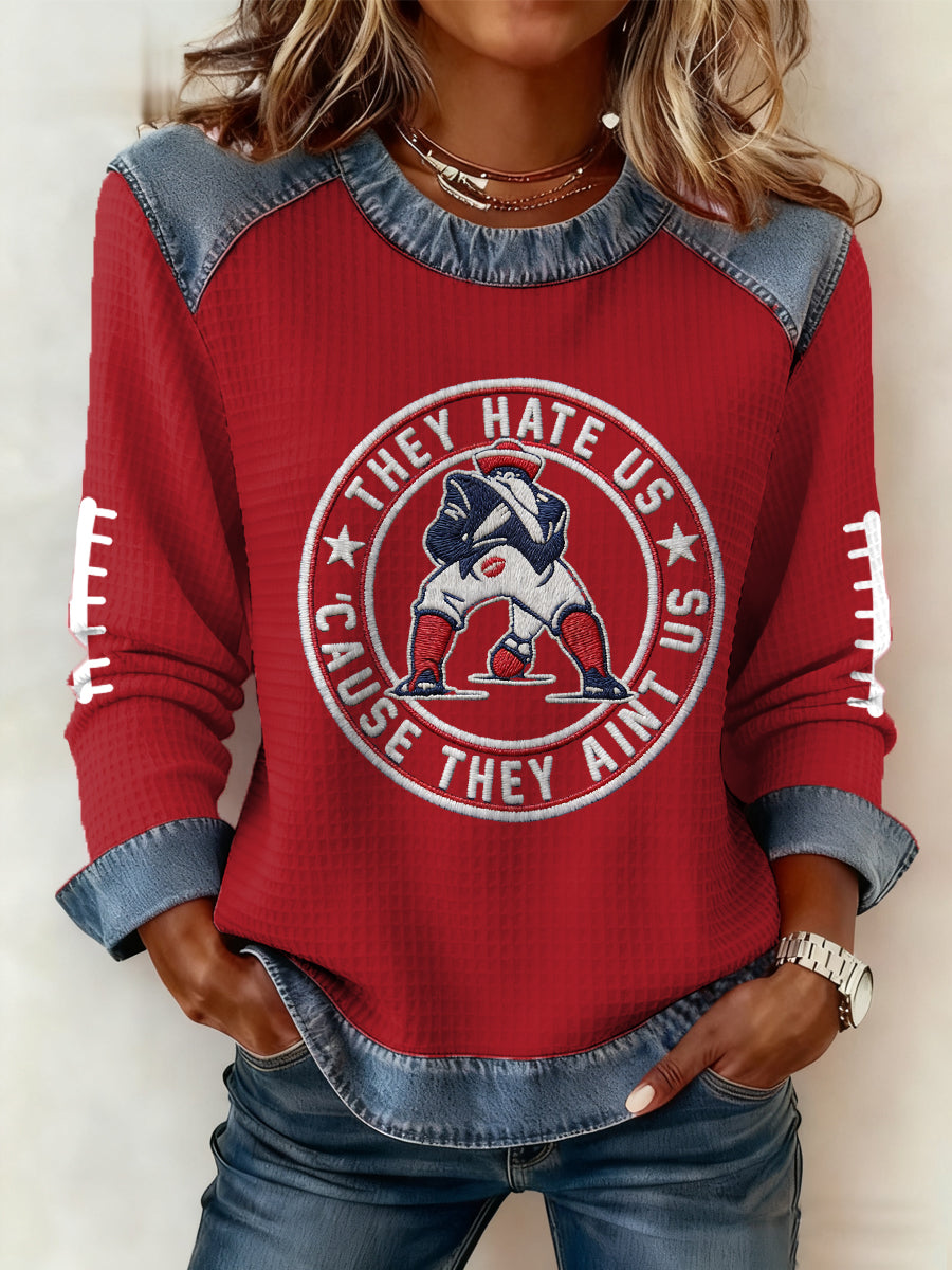 Women's They Hate Us Cause They Ain't Us Gift For Football Fans Gameday Casual Denim Patchwork Top