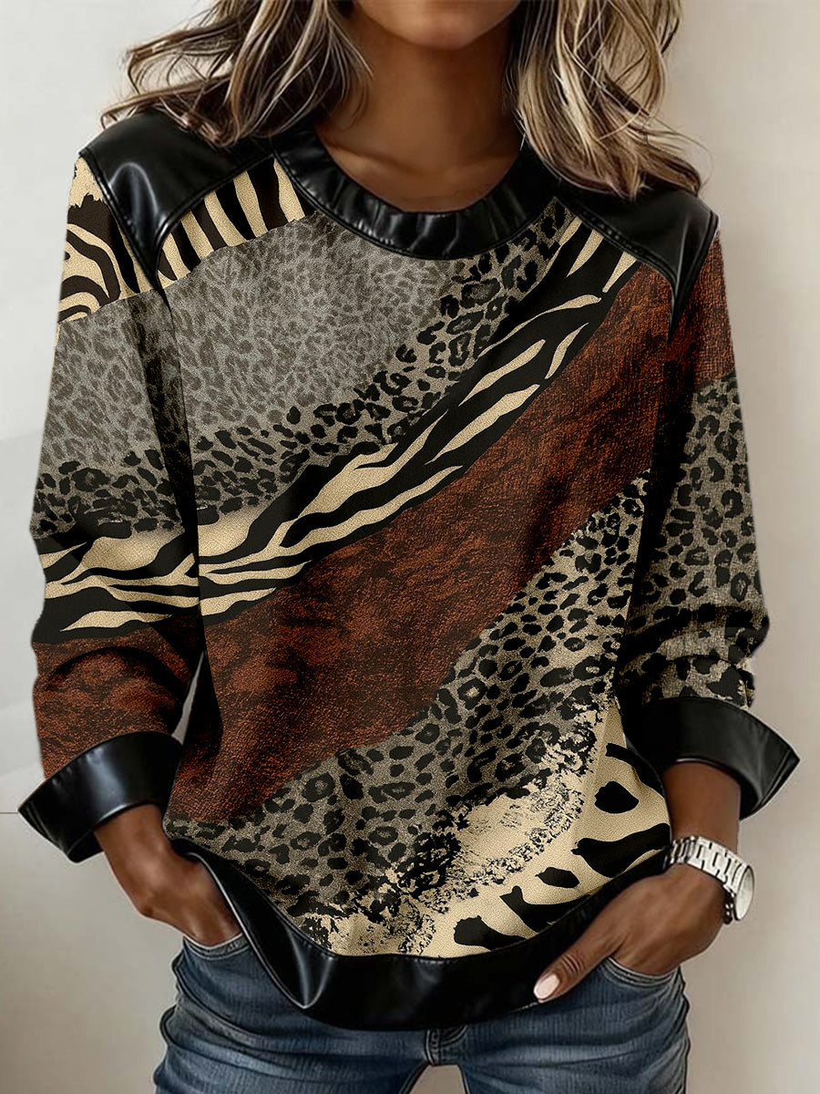 Women's Vintage Textured Print Leather Patchwork Sweatshirt